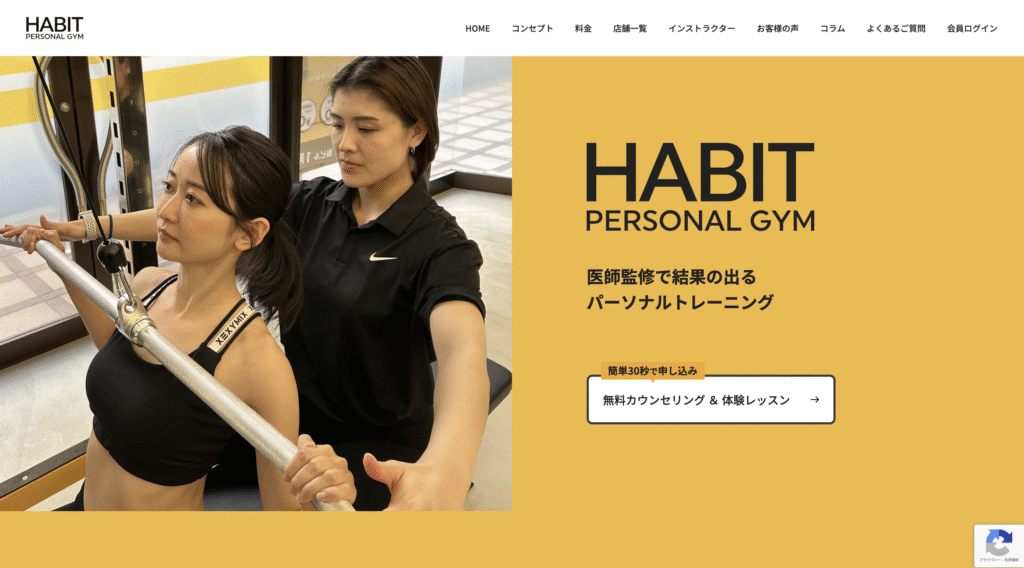 Habit Personal Gym (ハビットパーソナルジム)は、医師監修のもと、短時間で効率よく体を変えたい方におすすめのパーソナルトレーニングジムです。 特徴は下記です。