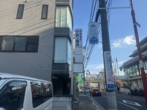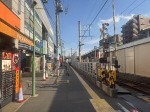 そのまま線路沿いの通りを、まっすぐ直進します。駅前から徒歩約1〜2分です。